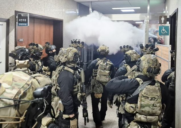 2024.12.3. 오후 11시 비상계엄선포 이후 서울 국회의사당에 계엄군이 진입했습니다. 국회 입구에서 출입이 막혔던 국회의원들이 12월 4일 새벽 1시에 모여 비상계엄 해제 요구를 가결했다고 합니다.