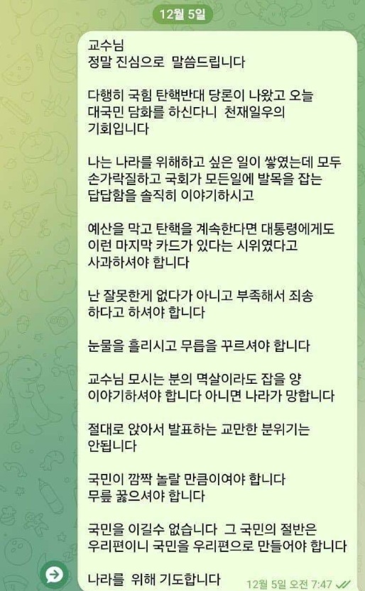 그런 충정으로 김태효 국가안보실 제1차장에게 텔레그램을 보내 윤 대통령이 비상계엄 사태를 사과하고 여론을 돌려야한다고 호소했다고 했습니다. 홍 전 차장과 김태효 차장은 마포고등학교 선후배 사이로 알려져 있습니다.